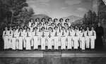 Description :33 GARCONS, HABILLES DE BLANC, PORTANT CRAVATE ET LARGE BERET BASQUE SONT DEBOUT SUR UNE SCENE. A DROITE, LE FRERE VALOIS, DIRECTEUR DE LA CHORALE. LA SCENE EST DOTEE D'UNE TOILE QUI REPRESENTE UN PAYSAGE.