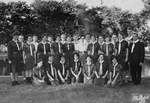 Description :DEVANT L'ETANG DU PARC LAFONTAINE, 25 CHANTEURS ET CHANTEUSES SONT REUNIS AVEC LEUR DIRECTEUR L'ABBE ARTHUR VEILLEUX, A DROITE, SUR LA PHOTO. ILS PORTENT LEUR UNIFORME DE GUIDE OU DE SCOUT. ONT ETE IDENTIFIES PAR UNE FLECHE: MARC-ANDRE LEGENDR...