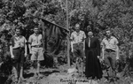 Description :DES MONITEURS ENTOURENT L'EMBLEME DES SCOUTS PRET A ETRE DEPLOYE. DE GAUCHE A DROITE, DENIS BERGERON, RENE MARTINEAU, PIERRE LACASSE, CHEF DE CAMP, L'ABBE ARTHUR VILLEMAIRE ET MARC RICHARD.
