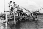Description :DIVERSES ACTIVITES DE CONSTRUCTION DE STRUCTURES FAITES EN BOIS ET EN TOILE. 3.1 - MAISON SUR PILOTIS AVEC PASSERELLE LA RATTACHANT AU BORD DU LAC. QUELQUES SCOUTS EMPRUNTENT LA PASSERELLE. UNE FILLETTE, UN BEBE ET UN CHIEN VISITENT LE LIEU. 3...