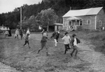 Description :DES GARCONS ET DES FILLES COURENT DEVANT UN CHALET RUSTIQUE RECOUVERT DE PLANCHES POSEES A CLIN. UNE RELIGIEUSE LES ACCOMPAGNENT.