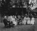 Description :DANS LES JARDINS DE LA RESIDENCE MCCREA, DES HOMMES ET DES FEMMES DEAMBULENT OU REPOSENT SUR DES CHAISES DROITES EN BOIS. DE GAUCHE A DROITE: F.N. MCCREA, WILFRID LAURIER, MESDAMES MCCREA ET LAURIER ET TROIS DAMES NON IDENTIFIEES.