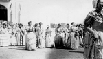 Description :DES FEMMES COSTUMEES QUITTENT LE PLATEAU DU KIOSQUE DU CENTENAIRE. ELLES SONT UNE CENTAINE.