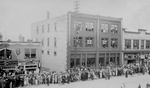 Description :1.1 : LA FOULE EST MASSEE LE LONG DE LA RUE BELVEDERE SUD. SONT VISIBLES: LES COMMERCES DONAHUE ELECTRIC ET ENSEIGNES SIGNS J. LAJEUNESSE. APRES UN ESPACE, EDIFICE DENAULT LIMITEE DE 3 ETAGES, PUIS EDIFICE DE 2 ETAGES (MUNKITTRICK). LA RAISON ...