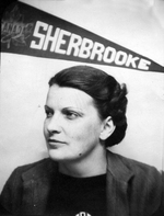 Description :JEUNE FILLE PLACEE SOUS UN FANION PORTANT LE NOM SHERBROOKE. PHOTO EN BUSTE.