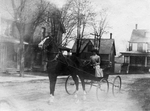 Description :ALICE, VETUE D'UN TAILLEUR, EST INSTALLEE DANS LA VOITURE FAMILIALE TIREE PAR UN CHEVAL. ELLE CIRCULE SUR LA RUE GORDON. EN ARRIERE-PLAN, LES RESIDENCES DE LA RUE SANBORN.