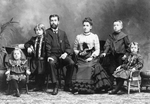 Description :PHOTO DE STUDIO. LES PARENTS SONT AU CENTRE; LES ENFANTS, PROBABLEMENT TROIS GARCONS ET UNE FILLE SONT ASSIS DE CHAQUE COTE DU COUPLE. SIEGES DE ROTIN, FAUTEUIL D'EBENE, GUERIDON, ETC. FORMENT LE DECOR.