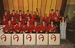 Description :LES ARMONIC, VETUS DE ROUGE, PRENNENT LA POSE SUR UNE SCENE ORNEE D'UNE TOILE AVEC BANDES EN DIVERS COLORIS DE JAUNE. UNE CHANTEUSE EN ROBE LONGUE ACCOMPAGNE LE GROUPE.