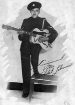 Description :LE SOLDAT LEBRUN, DEBOUT, LE PIED SUR UN BANC, GRATTE SA GUITARE EN SOURIANT A L'OBJECTIF. IL EST EN UNIFORME MILITAIRE, LA CASQUETTE INCLINEE SUR LA TETE. SA SIGNATURE APPARAIT DE BIAIS A DROITE.