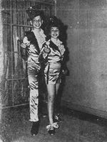 Description :DEUX ENFANTS, FRERE ET SOEUR, PRENNENT LA POSE EN COSTUME DE SATIN. ILS PORTENT SOULIERS DE DANSE A CLAQUETTES, HAUT-DE-FORME, CANNE A POMMEAU, CHEMISE A VOLANTS ET COSTUME AVEC LISERE CONTRASTANT A LA JAMBE.