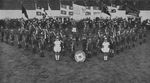 Description :LES CADETS SONT PLACES EN TRIANGLE. A L'AVANT, LES CHEFS DE LA FANFARE. A L'ARRIERE, NEUF DRAPEAUX DEPLOYES DONT DES DRAPEAUX DU QUEBEC, CEUX DU VATICAN ET CELUI DES CADETS.