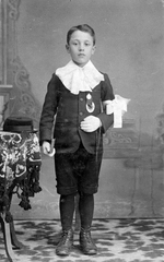 Description :PHOTO DE PIED EN CAP D'UN PREMIER COMMUNIANT PORTANT BRASSARD ET CHAPELET AU BRAS GAUCHE, ET TENANT UN MISSEL A LA MAIN DROITE. DECOR EN TROMPE-L'OEIL. LA CASQUETTE DU GARCON EST POSEE SUR UNE TABLE DECORATIVE.
