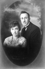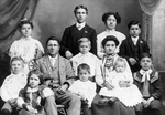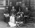 Description :ALFRED-ZEPHIRIN COUTURE ET SON EPOUSE SONT ENTOURES DE LEURS HUIT ENFANTS DEVANT LEUR DOMICILE. LES GARCONS PORTENT UNE BRANCHE DE MUGUET EN BOUTONNIERE TANDIS QUE MADAME COUTURE PORTE UN BOUQUET DE TULIPES. A L'ARRIERE-PLAN, QUELQUES BADAUDS ...