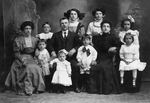 Description :PHOTO DE STUDIO AVEC DECOR EN TROMPE-L'OEIL. COUPLE AVEC LEURS NEUF ENFANTS. QUELQUES DETAILS INTERESSANTS: UNE FILLE QUI LOUCHE, DE PETITS SOULIERS A MULTIPLES COURROIS, LES GROS NOEUDS DE SOIE DANS LES CHEVEUX OU SUR LES BLOUSES DES ENFANTS ...