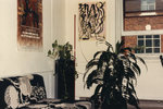 Description :VUE PARTIELLE DE LA PIECE. UN TABLEAU ABSTRAIT AUX COULEURS ROSES, NOIRES ET BLANCHES EST AFFICHE AU MUR AINSI QU'UNE AFFICHE SUR LES JOURNEES DU CINEMA AFRICAIN. SUR LA GAUCHE, UN DIVAN BLANC, NOIR ET BEIGE A MOTIFS. DEUX PLANTES DECORENT L'E...