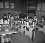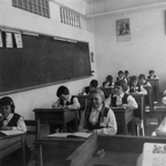 Description :PARTIE D'UNE CLASSE DE FILLES DE 4E ANNEE. LES FILLETTES SONT A LEUR PUPITRE EN BOIS ET PORTENT UN UNIFORME. A GAUCHE, TABLEAU NOIR. A L'AVANT, PUPITRE DE L'ENSEIGNANTE.