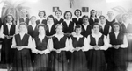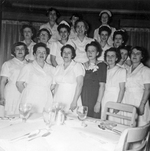 Description :PLACEES SUR TROIS RANGEES, 16 EMPLOYEES DU RESTAURANTS PRENNENT LA POSE DERRIERE UNE TABLE DE LA SALLE A MANGER. AU PREMIER RANG, LA 3E EST MME LETARTE ET LA 4E EST MME AUDET EN ROBE D'HOTESSE. AU 2E RANG, LA 2E EST MME ROUVILLE, LA 5E EST DOR...