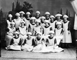 Description :20 JEUNES FILLES PRENNENT LA POSE EN TABLIER BLANC ET LARGE COIFFE. AU CENTRE, UNE DAME TIENT UN BOUQUET. C'EST PEUT-ETRE LEUR PROFESSEUR. ROSA LAMBERT EST LA PREMIERE DE DROITE SUR LE DEUXIEME RANG.