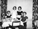 Description :QUATRE EMPLOYES DU RESTAURANT PRENNENT LA POSE DERRIERE UNE TABLE DE LA SALLE A DINER. CE SONT DE GAUCHE A DROITE: ? EN UNIFORME ET PORTANT UNE COIFFE; PAULINE PRONOVOST EN UNIFORME BLANC; ALICE DOSTIE EN UNIFORME, AGEE DE 24 ANS; MONA HARPER ...