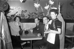 Description :ALICE DOSTIE, DEBOUT, PREND LA COMMANDE DE CLIENTS ATTABLES. UN DECOR EST PEINT SUR LES MURS ET LES BANQUETTES COMPRENNENT UNE TABLE EN FORMICA.