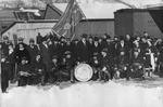 Description :DEVANT UN ENTREPOT DE BOIS, LES RAQUETTEURS SONT VETUS DE LEUR UNIFORME. DEVANT LE GROUPE, ALIGNEMENT DE TAMBOURS ET DE GROSSES CAISSES PORTANT LE LOGO DU CLUB. A L'ARRIERE, DRAPEAU DEPLOYE.