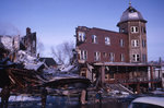 Description :LES RUINES DE L'HOTEL CHATEAU FRONTENAC VUES DE LA RUE ABERDEEN. A GAUCHE, LE MUR EST EFFONDRE. A DROITE, UNE PARTIE DU MUR ET LA TOURELLE SONT TOUJOURS DEBOUT. SUR LA RUE, DES GENS DERRIERE UNE CLOTURE REGARDENT LE BATIMENT. EN AVANT-PLAN, L'...