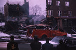 Description :LES POMPIERS EN TRAIN D'ARROSER L'HOTEL CHATEAU FRONTENAC VUS DE LA RUE ABERDEEN. A GAUCHE, LE BATIMENT EST EFFONDRE. SUR LA RUE IL Y A UN CAMION DE POMPIERS ET DEUX AUTOMOBILES. A L'AVANT, QUATRE HOMMES OBSERVENT LA SCENE.
