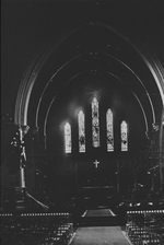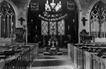 Description :VUE DU COEUR DE L'EGLISE ST.PETER'S SURMONTE D'UN TOIT EN FORME D'ARCHE. A GAUCHE, LA CHAIRE. AU CENTRE, L'AUTEL AVEC UNE CROIX. AU-DESSUS, CINQ VITRAUX. EN AVANT-PLAN, L'ALLEE CENTRALE ET DES CHAISES PLACEES EN LIGNE.