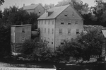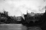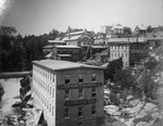 Description :VUE SUR LA RIVIERE MAGOG. A GAUCHE, LE BARRAGE N.4. A DROITE, LE BATIMENT DE LA EASTERN TOWNSHIPS CORSET CO. EN ARRIERE-PLAN, PLUSIEURS BATIMENTS DONT CEUX DE LA JENCKES MACHINE CO. ET DE LA BURTON BREWERY SUR LA RUE BANK.