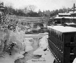 Description :GROS PLAN DE LA EASTERN TOWNSHIPS CORSET CO. L'HIVER. A DROITE, LA RIVIERE MAGOG. EN ARRIERE-PLAN, LE BARRAGE N.4 ET LES EDIFICES DE LA JENCKES MACHINE CO. A NOTER, IL Y A DES FILS ELECTRIQUES AU-DESSUS DE LA RIVIERE MAGOG.