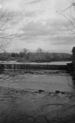 Description :VUE SUR LE BARRAGE ELECTRIQUE A HUNTINGVILLE SUR LA RIVIERE MOE. A DROITE, LE COIN DE LA SCIERIE.