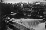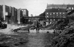 Description :VUE SUR LE BARRAGE N.5 SUR LA RIVIERE MAGOG. A DROITE, SUR LA BERGE, DES ECHAFFAUDAGES. A GAUCHE, DES BATIMENTS EN ESCALIER SITUES SUR LA RUE FRONTENAC. A L'ARRIERE DU BARRAGE, LE COIN DU BATIMENT DE LA ART GALLERY SUR LA RUE DUFFERIN ET LE PO...