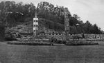 Description :VUE SUR LES RUINES DE L'HOTEL GLEN VILLA SITUE SUR LE BORD DU LAC MASSAWIPPI. ON APERCOIT LA FONDATION ET DEUX POTEAUX. EN ARRIERE-PLAN, DES ARBRES.