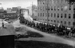 Description :LE 5TH C.M.R. DEFILE SUR DES CHEVAUX EN UNIFORME SUR LA RUE KING OUEST. A DROITE, LA PATON. A L'ARRIERE-PLAN, LE PONT MONTCALM ET DES MAISONS SUR LA RUE DE L'ESPLANADE.