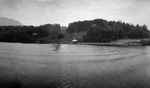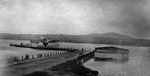 Description :VUE SUR LE LAC MEMPHREMAGOG. EN AVANT-PLAN, UN LONG QUAI DE BOIS AVEC AU BOUT, LE BATEAU A VAPEUR ANTHEMIS. IL Y A UNE PETITE CABANE DE BOIS SUR LE QUAI DEVANT LE BATEAU. EN ARRIERE-PLAN, LA RIVE OPPOSEE.