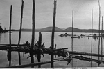 Description :VUE SUR LE LAC BROMPTON. EN AVANT-PLAN, DES RONDINS SONT COUCHES DANS L'EAU ET D'AUTRES SONT A LA VERTICALE. EN ARRIERE-PLAN, LES COLLINES DE LA RIVE OPPOSEE.