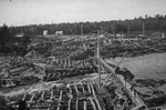 Description :LE BARRAGE DE LA BROMPTON PULP AND PAPER. A GAUCHE, DES TRONCS D'ARBRES EMPILLES LES UNS PAR DESSUS LES AUTRES. DES HOMMES TRAVAILLENT SUR LE DESSUS. A DROITE, LA RIVIERE ST-FRANCOIS. EN ARRIERE-PLAN, DES TRONCS D'ARBRES ET DEUX MAISONS SITUEE...