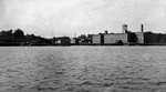 Description :VUE DE LA RIVIERE MAGOG. EN ARRIERE-PLAN, DES BATIMENTS. DE GAUCHE A DROITE, LA COUR DE BOIS DE LA SCIERIE D'AMERICAN LAND CO., LA SCIERIE ELLE-MEME ET LA PATON.
