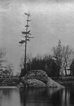 Description :VUE RAPPROCHEE D'UN PIN FRELE SUR UNE ILE ROCHEUSE SUR LA RIVIERE ST-FRANCOIS. A GAUCHE, UNE CLOTURE SUR LA BERGE. A DROITE, UNE MAISON.