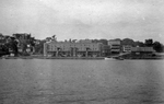 Description :VUE DES BERGES D'UNE RIVIERE. UN EDIFICE DE QUATRE ETAGES (UN HOTEL?) AVEC PARTIES EN SAILLIE EST VISIBLE. UN PETIT BATEAU REMPLI DE PASSAGERS FLOTTE AU COTE DROIT.