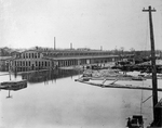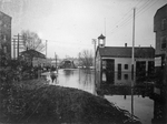 Description :VUE SUR LA JENCKES MACHINE CO. AU COIN DES RUES KING ET GRANDES-FOURCHES. CELLE-CI EST INONDEE. A DROITE, DES HOMMES, DES BILLOTS ET DES PLANCHES SUR L'EAU. EN AVANT-PLAN, UN POTEAU ELECTRIQUE.