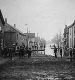 Description :LA RUE WINDSOR INONDEE VUE DE LA RUE KING OUEST. DE CHAQUE COTE DE LA RUE, DES BADAUDS REGARDENT LA SITUATION. EN ARRIERE-PLAN, DEUX CHALOUPES CIRCULENT SUR LA RUE. A NOTER, LA PRESENCE DE POTEAUX ELECTRIQUES SUR LE COTE GAUCHE DE LA RUE.