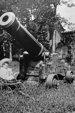 Description :UN JEUNE GARCON ASSIS DANS UN LANDEAU. IL PORTE UN CHAPEAU A LARGE BORD. A DROITE, UN CANON DONT LE SOCLE EST EN MAUVAIS ETAT. EN ARRIERE-PLAN, DES ARBRES ET LA MAISON SANBORN (A VERIFIER) SUR LE BOULEVARD QUEEN NORD.