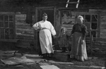 Description :VUE DE DEUX FEMMES ENTOURANT UNE FILLETTE. CELLE DE GAUCHE EST PLUS JEUNE QUE CELLE DE DROITE. ELLE EST PROBABLEMENT SA FILLE. ELLES PORTENT DES ROBES LONGUES. EN ARRIERE-PLAN, UNE MAISON DE BOIS.