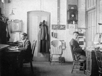 Description :DEUX COMPTABLES DANS LEUR BUREAU. A GAUCHE, ALEX JOHNSON EN TRAIN D'ECRIRE. A DROITE, HARRY MCLEAN REGARDE L'OBJECTIF. EN ARRIERE-PLAN, UNE PORTE AVEC UN MANTEAU SUSPENDU A UN CROCHET. A GAUCHE, UNE PETITE ARMOIRE. A DROITE, UNE CHAISE ET UNE ...