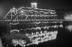 Description :LE PONT MONTCALM SUR LA RIVIERE MAGOG. CELUI-CI EST ILLUMINE PAR DES LUMIERES DANS LE CADRE DU CENTENAIRE. EN ARRIERE-PLAN, LA PATON AVEC SA TOURELLE ILLUMINEE. LES LUMIERES SE REFLECHISSENT DANS LA RIVIERE.