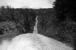 Description :VUE DE LA ROUTE VERS LE LAC BROMPTON, ACTUELLE ROUTE 220. LE CHEMIN EST EN TERRE. DE CHAQUE COTE, DES ARBRES. AU LOIN, LE MONT ORFORD.