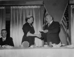 Description :10.1 - JAMES RIDDLE SANGSTER SERRE LA MAIN DE JULIETTE LABELLE OU WINIFRED MERRILL TOUT EN LUI REMETTANT UN CADEAU. DEVANT EUX, UNE TABLE. EN ARRIERE-PLAN, DEUX DRAPEAUX ENTRE-CROISES DERRIERE JAMES RIDDLE. 10.2 - IDEM QUE 10.1 SAUF QUE POUR L...