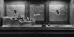 Description :COMPTOIR SUR LEQUEL ON APERCOIT DIFFERENTES PLUMES ET RESERVOIRS D'ENCRE. EN ARRIERE-PLAN, TROIS FENETRES SUR LESQUELLES SONT AFFICHEES DES PUBLICITES.