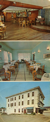 Description :TROIS IMAGES SUR LA CARTE. AU BAS: HOTEL DE BIAIS, VUE PARTIELLE DU STATIONNEMENT, LES ENSEIGNES TAVERNE ET LASALLE HOTEL. LES FENETRES AVANT ET UNE VITRINE SUR LE COTE GAUCHE ONT DES AUVENTS EN TOILE VERTS. AU CENTRE: VUE DE LA SALLE A MANGER...